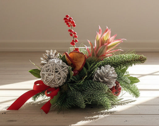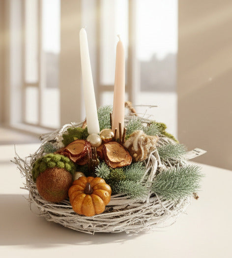 Il Natale si vive a tavola, tra il profumo dei rami di pino e la luce calda delle candele. I nostri centrotavola artigianali sono pensati per trasformare ogni cena in un momento magico. Realizzati a mano con elementi naturali, pigne e decorazioni preziose, sono il dettaglio che rende indimenticabile l'atmosfera della tua casa.