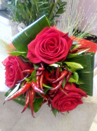 Rose lavorate rotonde tipo bouquet con elementi di complemento verdi decorativi ed incarto abbinato.