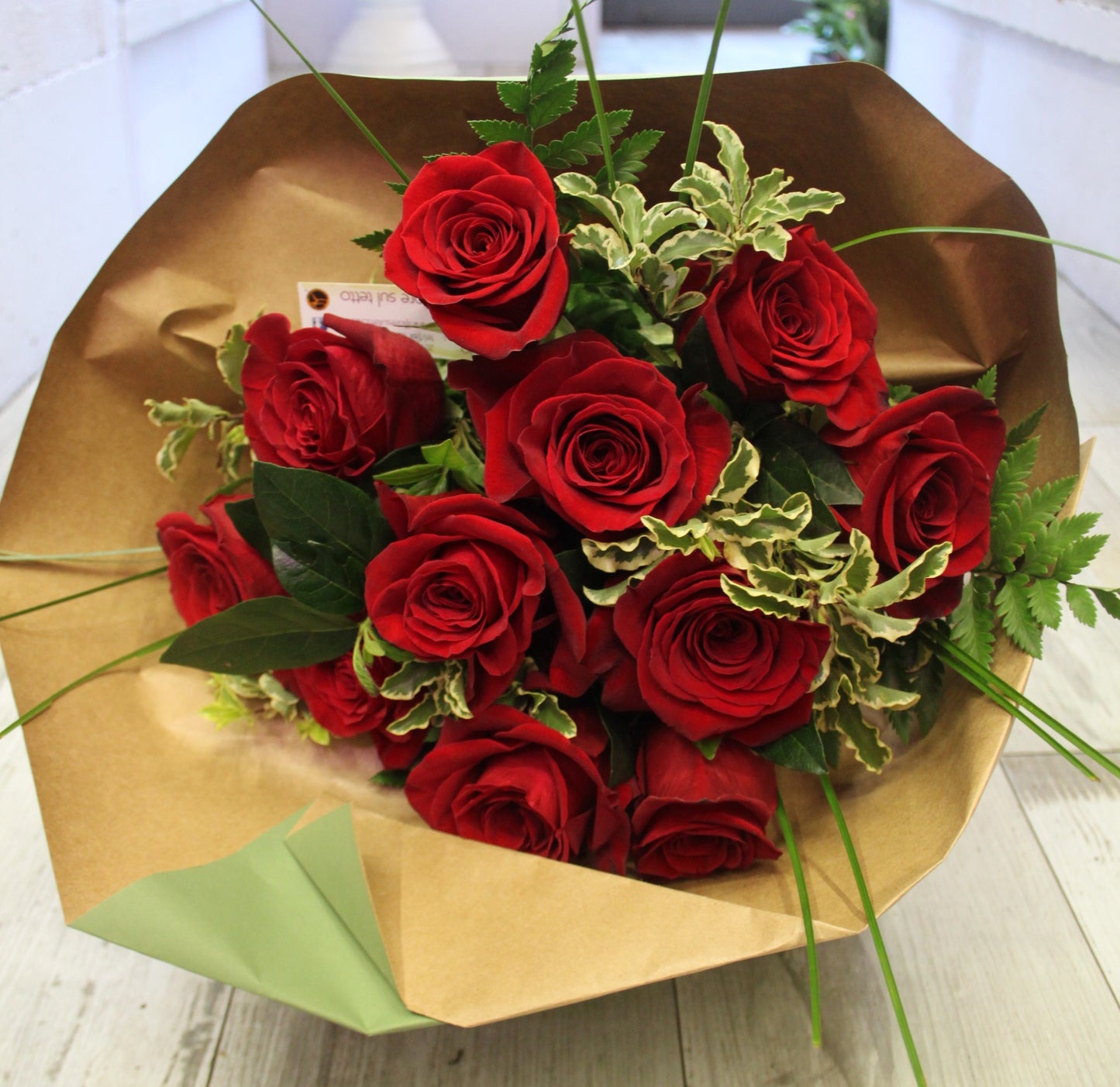 Rose Medie confezionate a spirale verdi decorativi ed incarto abbinato.