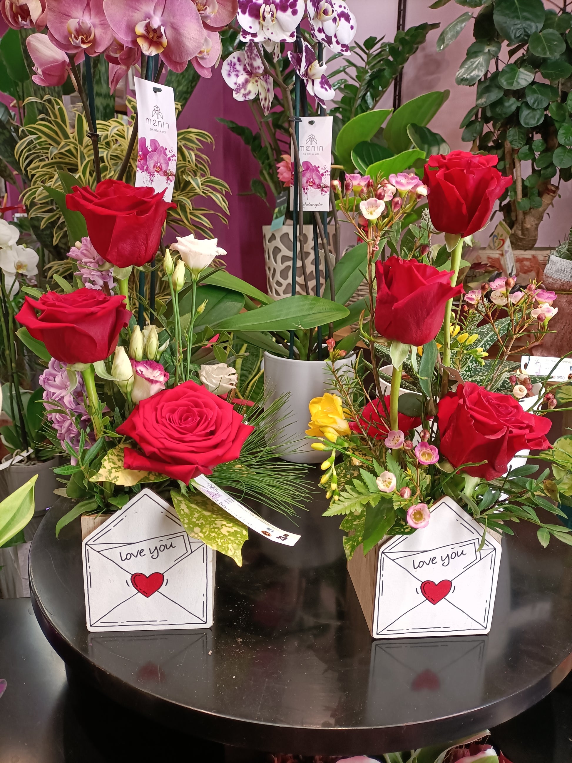 Composizione con 3 rose rosse e fiori freschi.- dimensione cassetta cm 10x10h cm -